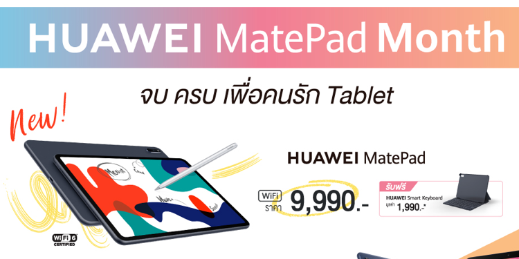 HUAWEI MatePad รุ่นล่าสุดมาพร้อมชิปเซ็ตอัปเกรดใหม่ทรงประสิทธิภาพ Kirin 820 เพื่อการประมวลผลที่เร็วและแรงขึ้น ผสานขุมพลังของ RAM ขนาด 4 GB และหน่วยความจำที่สูงขึ้นถึง 128 GB ให้ผู้ใช้ สามารถเก็บความทรงจำทั้งภาพนิ่ง ภาพเคลื่อนไหว รวมถึงคอนเทนต์บันเทิงต่างๆ ได้อย่างเต็มที่ บนจอ FullView Display 10.4 นิ้ว ความละเอียดแบบ FHD 2K พร้อมด้วยลำโพงที่ใช้เทคโนโลยี HUAWEI Histen 6.1 ปรับแต่งคุณภาพโดย harman/kardon เติมเต็มอรรถรสให้กับทุกๆ วันโดยไร้กังวลเรื่องแบตเตอรี่เพราะให้มาถึง 7250 mAh ทั้งยังตอบโจทย์คนวัยเรียนด้วย HUAWEI Memo ที่มากับตัวเครื่อง และ HUAWEI M-Pencil ในการจดบันทึก วาดเขียน รวมถึงคำนวณตัวเลขด้วยฟีเจอร์เครื่องคิดเลขอัจฉริยะที่เพียงเขียนสมการลงไปก็จะได้คำตอบโดยอัตโนมัติ มากไปกว่านั้น HUAWEI MatePad รุ่นอัพเกรดใหม่นี้ยังรองรับ WiFi 6 เพื่อการเชื่อมต่อกับเครือข่ายอนาคตสำหรับการใช้ชีวิตที่ไร้รอยต่อยิ่งกว่าที่เคยอีกด้วย โดยลูกค้าสามารถซื้อ HUAWEI MatePad สี Midnight Grey ได้ในราคา 9,990 บาท พร้อมรับฟรี HUAWEI Smart Keyboard มูลค่า 1,990 บาท ให้ประสบการณ์การใช้แท็บเล็ตสมบูรณ์แบบยิ่งขึ้น