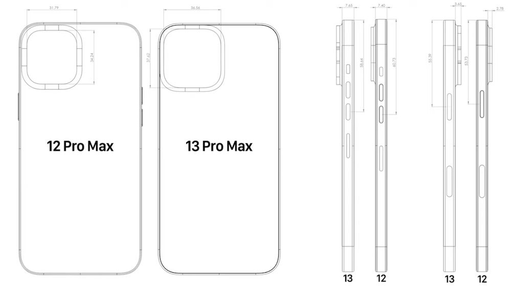 สำหรับ iPhone 13‌ Pro โมดูลกล้องจะมีความสูง 3.41 มิลลิเมตร กว้าง 4.81 มิลลิเมตร ซึ่งใหญ่กว่า iPhone 12‌ Pro อยู่เล็กน้อย อีกทั้งยังนูนหรือยื่นออกมา 3.65 มิลลิเมตร ขณะที่ iPhone 12‌ Pro ยื่นออกมา 2.79 มิลลิเมตร