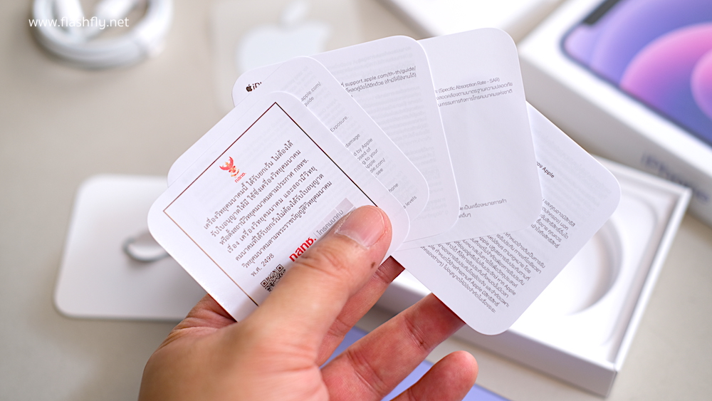 หลังจากหยิบ iPhone 12 ขึ้นมา จะพบซองเอกสารขนาดเล็กที่ภายในจะใส่เอกสาร เข็มจิ้มถาดใส่ซิมการ์ด เอกสารการการรับประกัน การใช้งานเบื้องต้นในรูปแบบภาษาไทย เอกสารจาก กสทช. และสติกเกอร์โลโก้ Apple มาให้เพียงชิ้นเดียว จากที่เคยแถมมาให้ 2 ชิ้น
