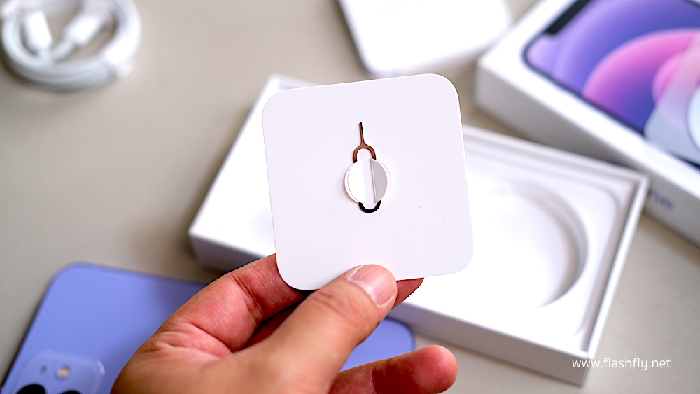 เมื่อยกฝากล่องออกไป ก็จะพบกับ iPhone 12 สีม่วง นอนคว่ำหน้าอยู่ โดยมีแผ่นกระดาษช่วยดึง iPhone ออกจากกล่อง