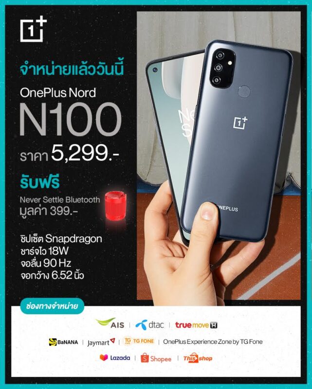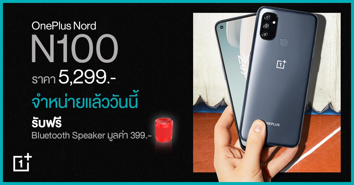OnePlus Nord N100 เปิดให้เป็นเจ้าของได้แล้ววันนี้ ตัวแทนจำหน่ายอย่างเป็นทางการทั่วประเทศพร้อมรับฟรี! ของแถมสุดพิเศษลำโพง Bluetooth Speaker มูลค่า 399 บาท ที่ช่องทางจำหน่ายผู้ให้บริการเครือข่ายทั้ง AIS, DTAC และ Truemove H รวมทั้ง BaNANA IT, Jaymart, , TG FONE ที่ร่วมรายการทั่วประเทศและ OnePlus Experience Zone by TG FONE ตลอดจนช่องทางออนไลน์ได้ที่
