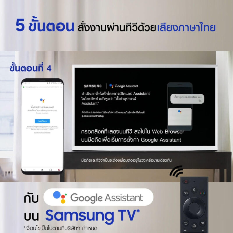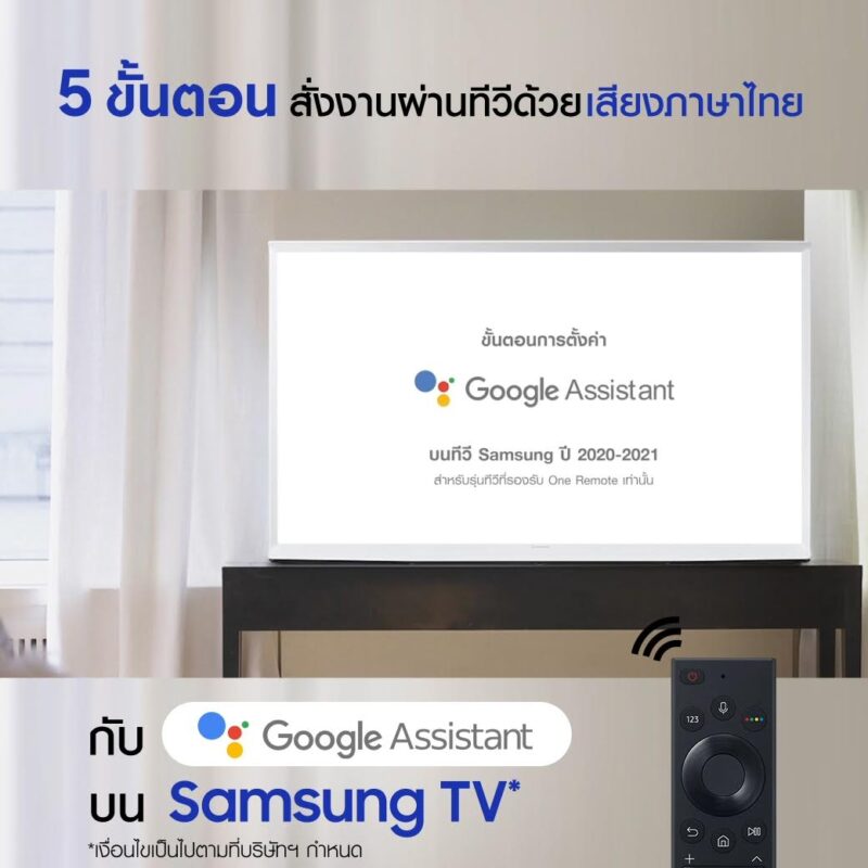 ศึกษาวิธีการตั้งค่า Google Assistant บนซัมซุงทีวี ได้ที่ https://www.youtube.com/watch?v=llYbPubBbLI หรือ https://www.samsung.com/th/support/tv-audio-video/use-google-assistant-on-your-2020-samsung-tv/ ผู้ที่สนใจผลิตภัณฑ์ทีวีของซัมซุง สามารถค้นหาข้อมูลได้ที่ https://www.samsung.com/th/tvs/