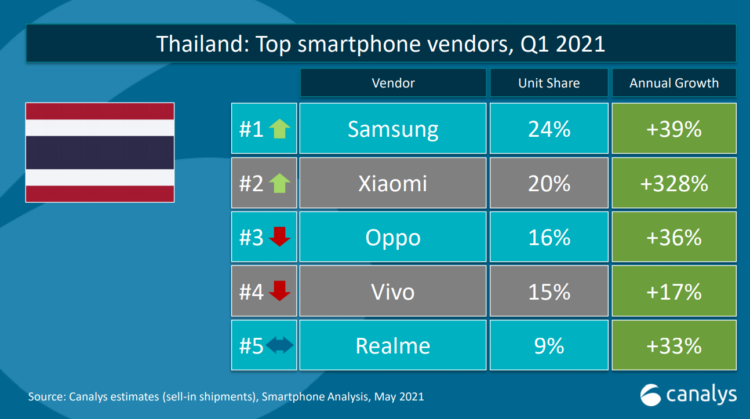 จากรายงานของบริษัทวิจัย Canalys พบว่า เสียวหมี่ ประเทศไทย เป็นแบรนด์ที่มีอัตราการเติบโตของยอดขายในไตรมาสแรกเพิ่มขึ้นสูงสุด โดยโตขึ้นจากช่วงเดียวกันของปีที่แล้ว 328% ส่งผลให้แบรนด์ก้าวขึ้นมาเป็นอันดับ 2 ของตลาดสมาร์ทโฟนในประเทศไทย สำหรับตลาดสมาร์ทโฟนทั่วโลก เสียวหมี่ยังคงครองอันดับ 3 โดยมียอดการเติบโตจากปีที่ก่อนสูงถึง 62% ซึ่งเป็นแบรนด์ที่เติบโตมากที่สุด