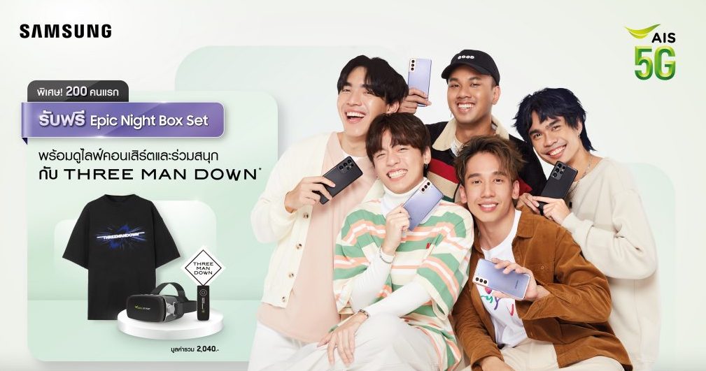 ยังไม่จบแต่เพียงเท่านั้น! เพราะทั้ง 3 แบรนด์ยังได้เตรียมอีกหนึ่งความพิเศษให้กับเหล่าแฟนเพลง ด้วยการส่ง ‘Epic Night Box Set’ ที่ออกแบบโดย THREE MAN DOWN จำนวนจำกัดเพียง 200 ชุด มูลค่า 2,040 บาท มาให้ทุกคนมีไว้ในครอบครอง เพียงแค่ซื้อ Samsung Galaxy S21 Series 5G ราคาพิเศษโครงการ Hot Deal และ Best Buy (ยกเว้นเครื่องเปล่า) ระหว่างวันนี้ – 31 พ.ค. 64 ที่ AIS Shop และ AIS Online Store พร้อมลงทะเบียนที่ www.ais.co.th/SamsungS21 ตั้งแต่วันที่ 7-31 พ.ค. 64 โดยภายในกล่องนั้นจะประกอบด้วย THREE MAN DOWN Galactic T-Shirt, แท่งไฟ THREE MAN DOWN และ AIS 5G VR Port