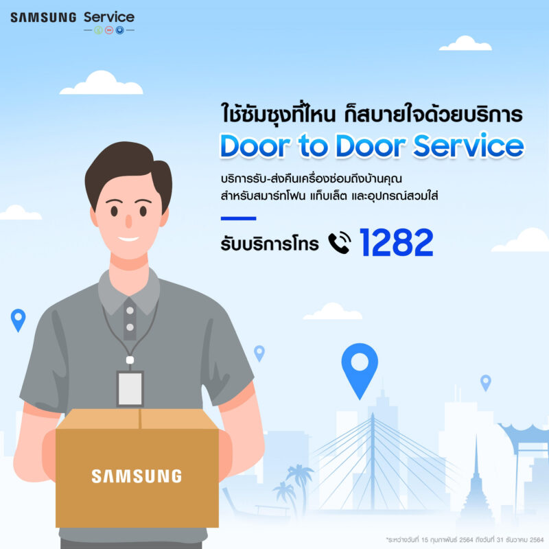 จะอยู่ที่ไหนก็ไม่ใช่ปัญหา เพราะวันนี้ซัมซุงพร้อมดูแลลูกค้าทุกท่านถึงที่เพื่อตอบรับวิถีแห่งNew Normal กับบริการ Door to Door Service (D2D) หรือบริการรับ-ส่งคืนเครื่องซ่อมถึงบ้าน บริการยุคใหม่สำหรับผลิตภัณฑ์ประเภทสมาร์ทโฟน แท็บเล็ต และอุปกรณ์สวมใส่ของซัมซุง พร้อมให้บริการฟรี ไม่มีค่าใช้จ่าย ซ่อมไว ได้เครื่องเร็วพร้อมทำความสะอาดฆ่าเชื้อไวรัส  เพื่อให้ลูกค้าทุกท่านสบายใจเมื่อใช้ผลิตภัณฑ์จากซัมซุง