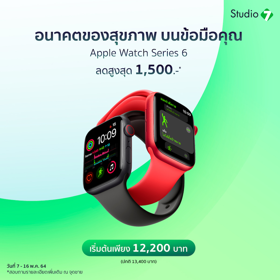 Studio 7 สนับสนุนให้คนดูแลสุขภาพ มอบส่วนลด Apple Watch Series 6 สูงสุด 1,500 บาท เริ่มต้นเพียง 12,200 บาท (จากราคาปกติ 13,400 บาท หมดเขตวันที่ 16 พฤษภาคม 2564 นอกจากนี้ ยังมีข้อเสนอสุดพิเศษรออยู่อีกที่ Studio 7 สาขาใกล้บ้าน
