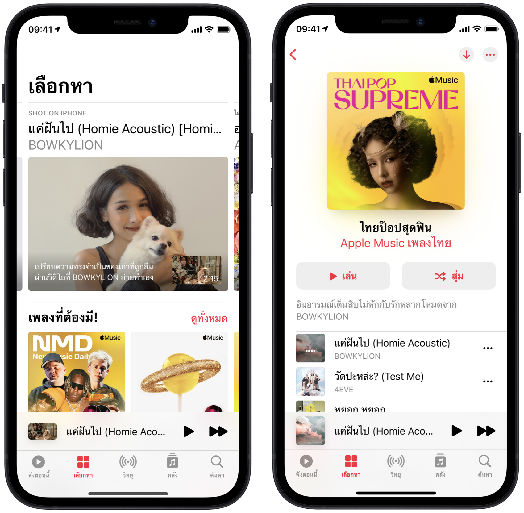 Apple Music คือบริการสตรีมเพลงแบบไม่มีโฆษณาที่ช่วยให้คุณฟังเพลงจากคลังเพลงกว่า 75 ล้านเพลง เพลย์ลิสต์มากมายหลายพัน และเพลงที่เลือกสรรมาให้ฟังทุกวันจากผู้เชี่ยวชาญด้านดนตรีที่ดีที่สุดของโลก ไม่ว่าจะเป็นศิลปินชื่อดังและผู้จัดรายการที่พากันมาจัดรายการทั้งในสถานี Apple Music 1, Apple Music Hits และ Apple Music Country ให้ฟังกันสด ๆ ทั่วโลก ตั้งแต่เปิดตัวครั้งแรกในปี 2015 Apple Music ได้มีผู้ใช้บริการมากมายกว่าหลายสิบล้านคนในทั้งหมด 167 ประเทศ ซึ่งในฐานะผู้สมัครใช้บริการ คุณจะสามารถฟังเพลงได้ทุกเมื่อ ไม่ว่าจะเป็นบน iPhone, iPad, Apple TV, Mac, Apple Watch, iPod touch, CarPlay, สมาร์ททีวีรุ่นต่าง ๆ, ลำโพงอัจฉริยะรุ่นต่าง ๆ, อุปกรณ์ Android และ Windows รวมถึงสามารถฟังออนไลน์ได้ที่ music.apple.com Apple Music จะมอบประสบการณ์ทางดนตรีที่สมบูรณ์แบบที่สุดให้กับคุณ สมัครวันนี้เพื่อทดลองใช้บริการ Apple Music ฟรีนาน 3 เดือน ดูข้อมูลเพิ่มเติมได้ที่ http://www.apple.com/th/music/