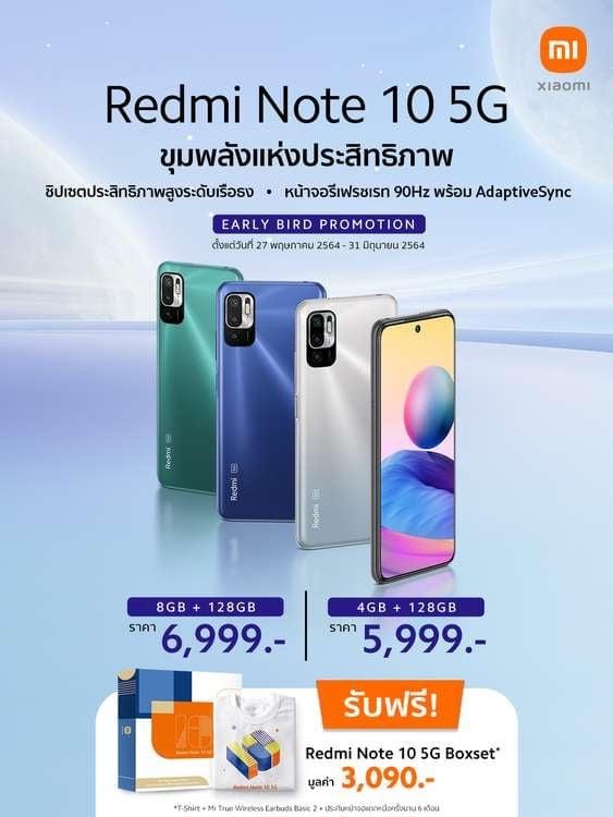 ผู้ที่ซื้อ Redmi Note 10 5G ตั้งแต่ 27 พฤษภาคม – 30 มิถุนายนนี้ รับฟรี Note 10 5G Box Set ประกอบด้วย Mi True Wireless Earbuds Basic 2 และ เสื้อยืด พร้อมประกันหน้าจอแตก 1 ครั้ง ในระยะเวลา 6 เดือน มูลค่ารวม 3,090 บาท