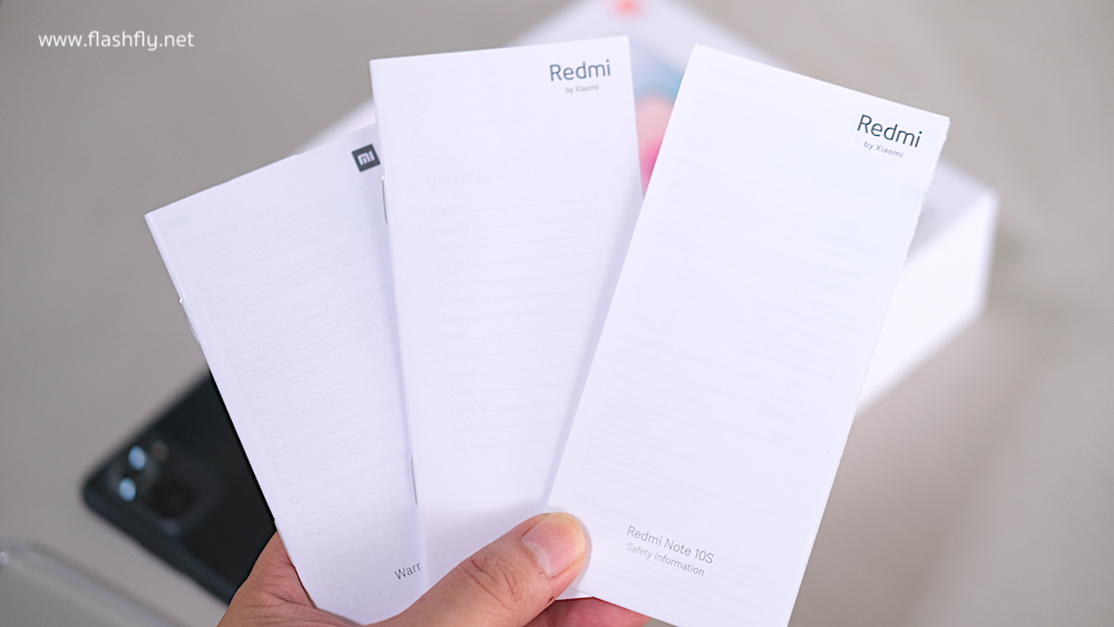 ภายในกล่องจะพบกับสมาร์ทโฟน Redmi Note 10S ที่มีแบตเตอรี่ในตัว ความจุ 5,000mAh พร้อมด้วยสายเคเบิล USB Type-C, อุปกรณ์ชาร์จแบตเตอรี่ 33W Power Adapter, เข็มจิ้มถาดซิมการ์ด, เคสใส, คู่มือแนะนำการใช้งาน Quick Start Guide, เอกสารด้านความปลอดภัย และ บัตรรับประกัน