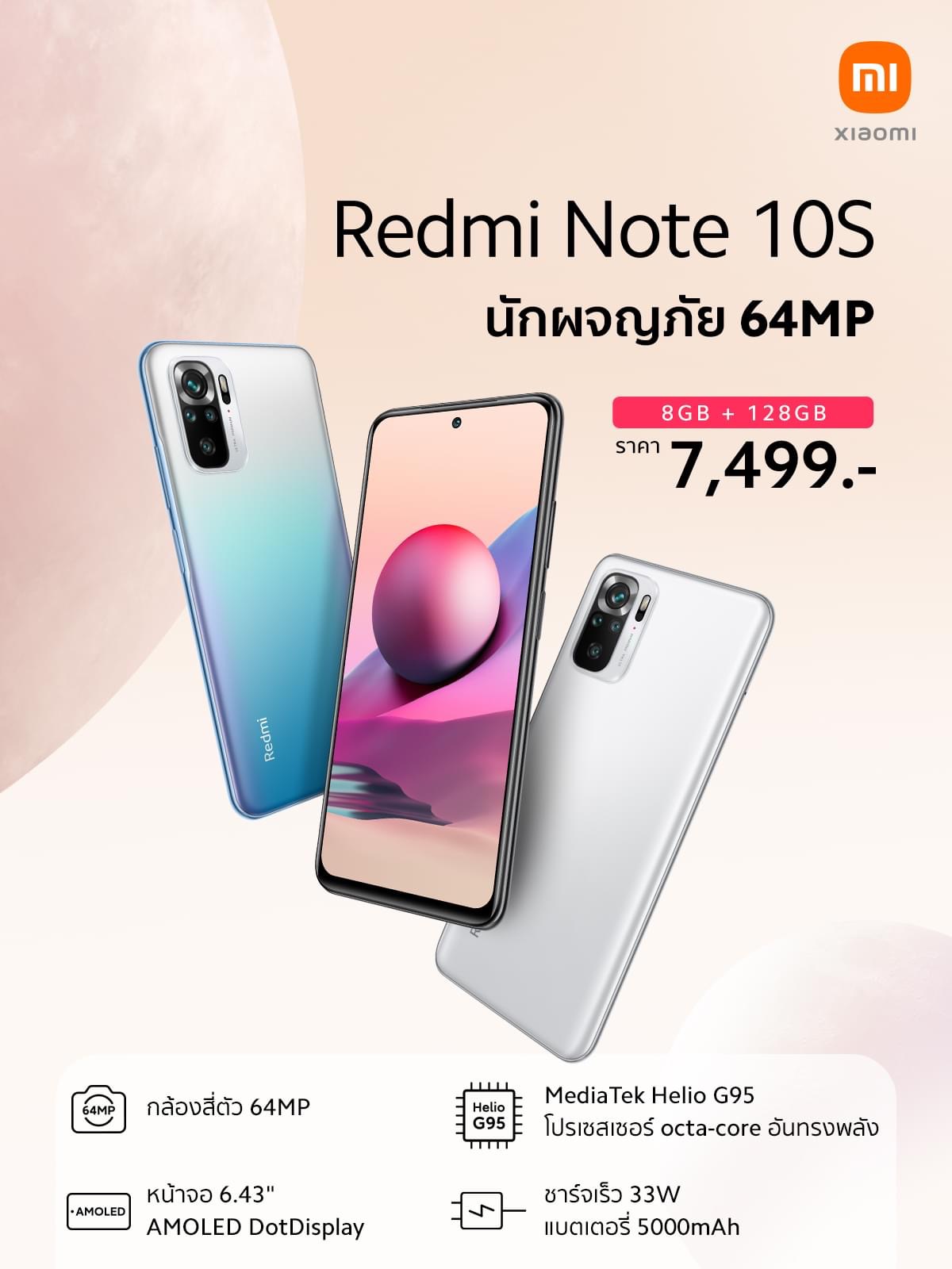 Redmi Note 10S มีจุดเด่นที่ความคมชัดของจอแสดงผล ระบบเสียงจากลำโพงคู่ กล้องถ่ายรูปความละเอียดสูงพร้อมกล้องมุมกว้างพิเศษ และรองรับชาร์จเร็ว 33W เหมาะสำหรับผู้ใช้งานที่ต้องการสมาร์ทโฟนที่เน้นความบันเทิง ชมคอนเท้นต์วิดีโอ และรักการถ่ายภาพ โดยไม่สนใจเทคโนโลยี 5G มีให้เลือก 3 สี ได้แก่ Onyx Gray, Pebble White และ Ocean Blue ราคา 7,499 บาท วางจำหน่ายพร้อมกันทั่วประเทศ ตั้งแต่วันที่ 27 พฤษภาคมเป็นต้นไป ที่ Mi Store ร้านค้าที่ร่วมรายการทั่วประเทศและช่องทางออนไลน์