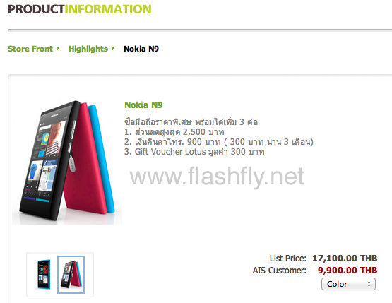 AIS ได้ทำการลดราคา Nokia N9 เหลือ 9,900 บาท จากราคาปกติ 17,100 บาท โดยต้องทำการซื้อผ่านระบบออนไลน์เท่านั้น และจะได้รับสิทธิพิเศษเพิ่มอีก 3 ต่อ ดังนี้