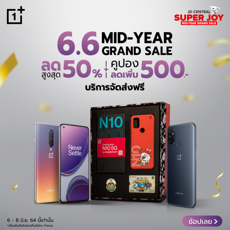 ต้อนรับเทศกาล 6.6 Mid-Year Sale กลางปี OnePlus แบรนด์สมาร์ทโฟนระดับเรือธงขนทัพโปรโมชันมากมายกับสมาร์ทโฟน, หูฟังและอุปกรณ์เสริม ลดสูงสุด 50% พร้อมคูปองส่วนลดเพิ่ม 500 บาท พิเศษ! ส่งฟรีทุกรายการทั้งสามช่องทางการจำหน่ายออนไลน์ Shopee, Lazada และ JD Central พิเศษกว่าทุกทีเพราะส่งฟรีทุกไอเท็ม! และยังมีของรางวัลแจกอีกเพียบ ช้อปโปรโมชั่นสุดคุ้ม OnePlus 6.6 ผ่านช่องทางออนไลน์ได้ที่