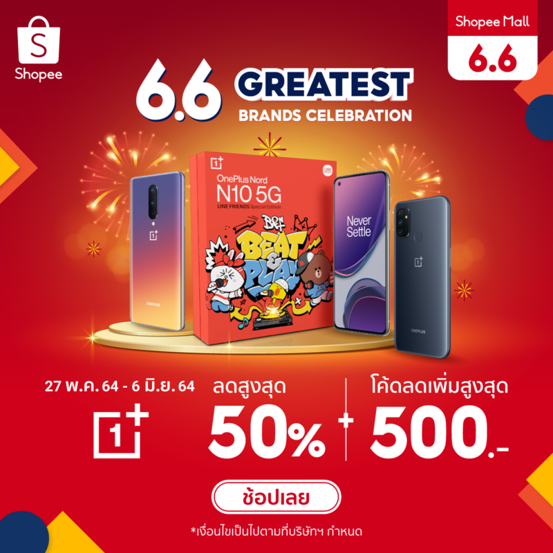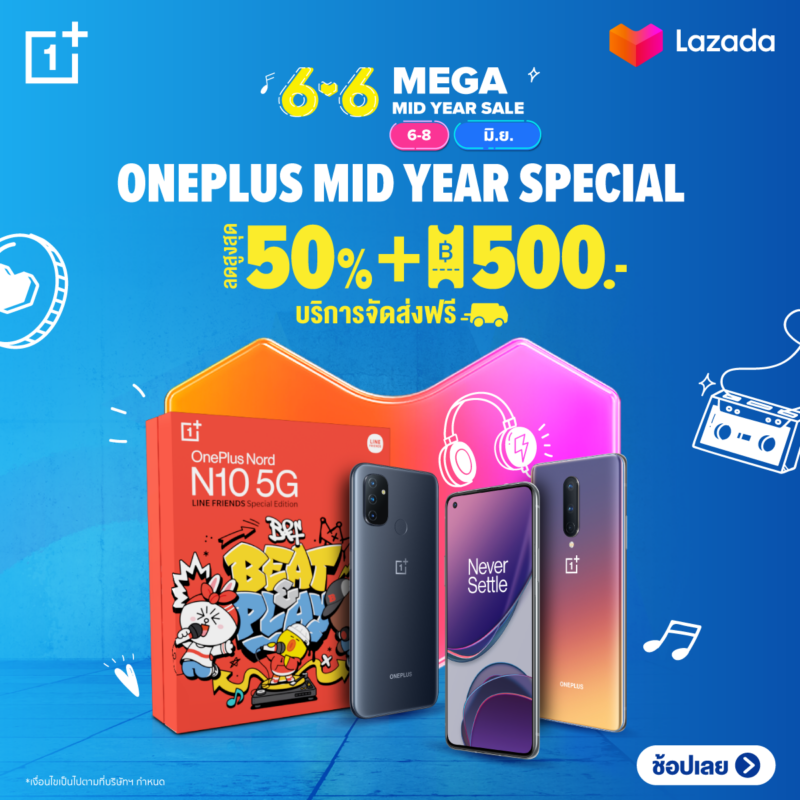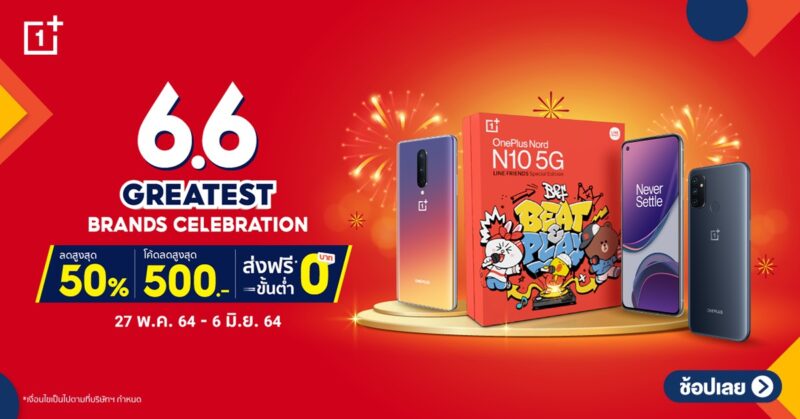 - 6 มิ.ย. 64 เวลา 9.00 / 12.00 / 18.00 น. – OnePlus Nord N10 Line Friends ราคาสุดพิเศษเพียง 4,990.- จาก 9,990.-