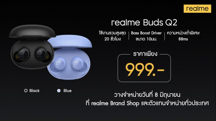 realme Buds Q2 ‘เสียงคมชัด ใช้ยาวนาน’ หูฟังไร้สายอัจฉริยะที่มาพร้อมแบตเตอรี่ใช้งานยาวนาน 20 ชั่วโมง ไดรเวอร์ Bass Boost ขนาด 10 มม. และโหมดความหน่วงต่ำพิเศษ 88ms ราคาพิเศษเพียง 999 บาท วางจำหน่ายพร้อมกันทั่วประเทศ ในวันที่ 8 มิถุนายนนี้ ที่ realme Brand Shop และตัวแทนจำหน่ายทั่วประเทศ