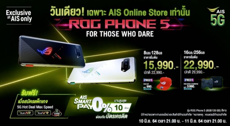 - ROG Phone 5 รุ่น RAM 8GB + ROM 128GB ราคา 22,990 บาท
