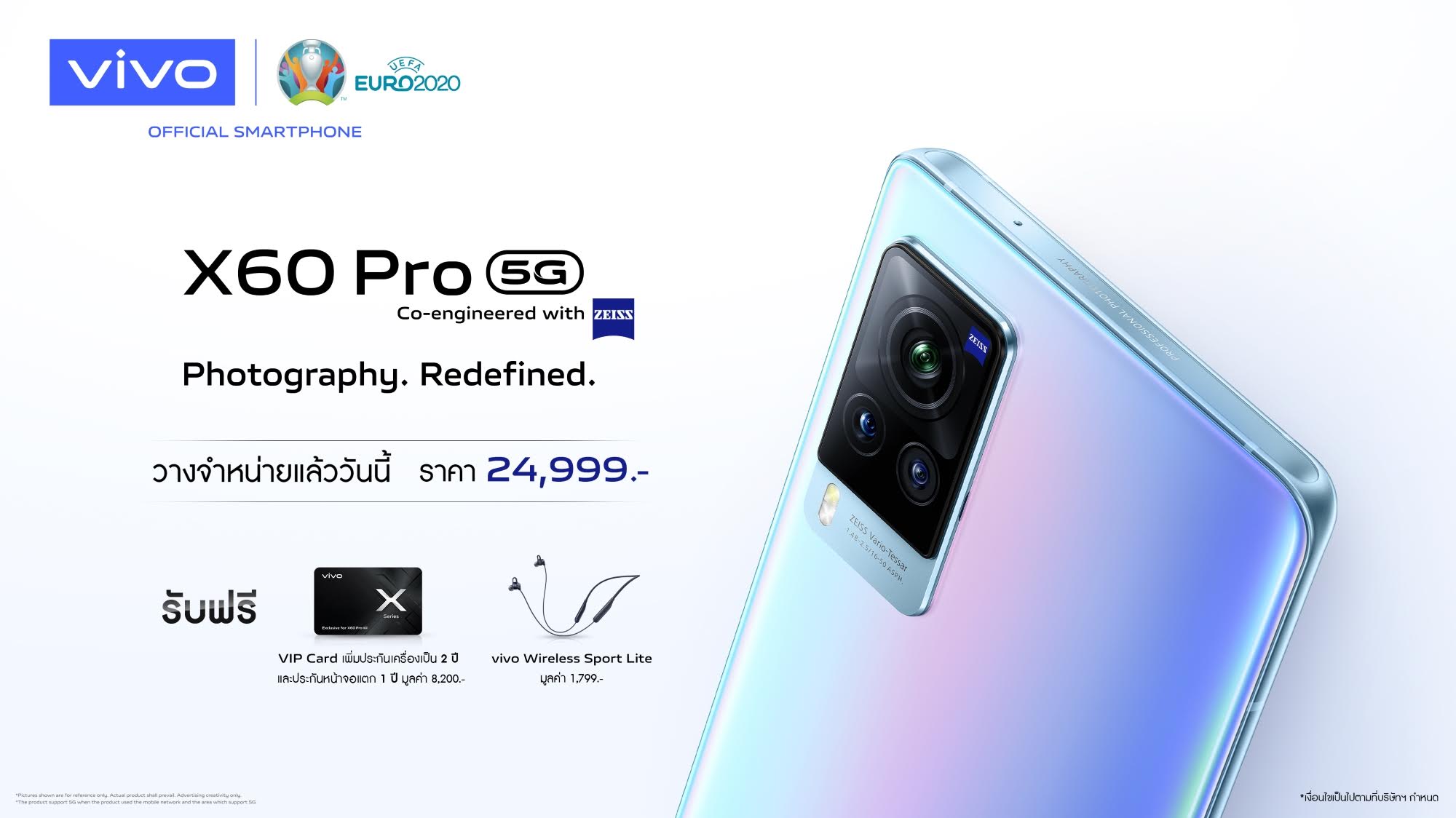 vivo X60 Pro 5G พร้อมวางจำหน่ายให้เป็นเจ้าของอย่างเป็นทางการแล้ววันนี้ ที่ราคา 24,999 บาท พิเศษ! รับฟรีทันที บัตร VIP Card รับประกันตัวเครื่องนาน 2 ปี พร้อมประกันหน้าจอแตก 1 ปี 1 ครั้ง มูลค่า 8,200 บาท และ หูฟัง vivo wireless sport lite มูลค่า 1,799 บาท (เงื่อนไขเป็นไปตามที่บริษัทกำหนด) มาร่วมเปิดนิยามใหม่ของการถ่ายภาพบนสมาร์ตโฟน พร้อมสัมผัสประสบการณ์การถ่ายภาพระดับมืออาชีพบน vivo X60 Pro 5G ได้แล้ววันนี้ที่ vivo Brand Shop ทุกสาขา ตัวแทนจำหน่ายชั้นนำ BaNANA, TG FONE, Jaymart, CSC, IT City, Kingkong, BKK, Maxling, Power Mall และช่อง vivo Official Online Store รวมถึง vivo Flagship Store บนร้านค้าออนไลน์ชั้นนำทั้ง Lazada, Shopee, JD Central และ Thisshop แฟน vivo ตัวจริง ห้ามพลาด! ติดตามรายละเอียดเพิ่มเติมได้ที่ https://www.vivo.com/th