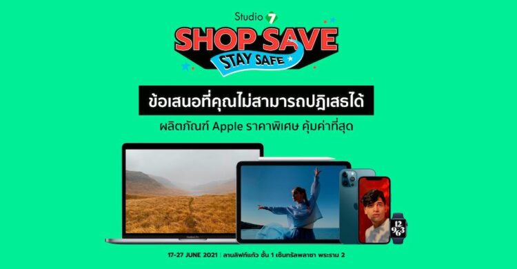 Studio 7 จัดกิจกรรม Studio 7 Shop Save Stay Safe ยกขบวนสินค้า Apple และ Accessories มาให้ช้อปอย่างปลอดภัยในราคาคุ้มค่า ลดสูงสุด 70% และยังให้ผ่อน 0% นานสูงสุด 36 เดือน กับธนาคารที่ร่วมรายการ นอกจากนี้ ยังสามารถนำมือถือเครื่องเก่า มาใช้แลกรับส่วนลดสำหรับซื้อสินค้าทุกชิ้นภายในงาน