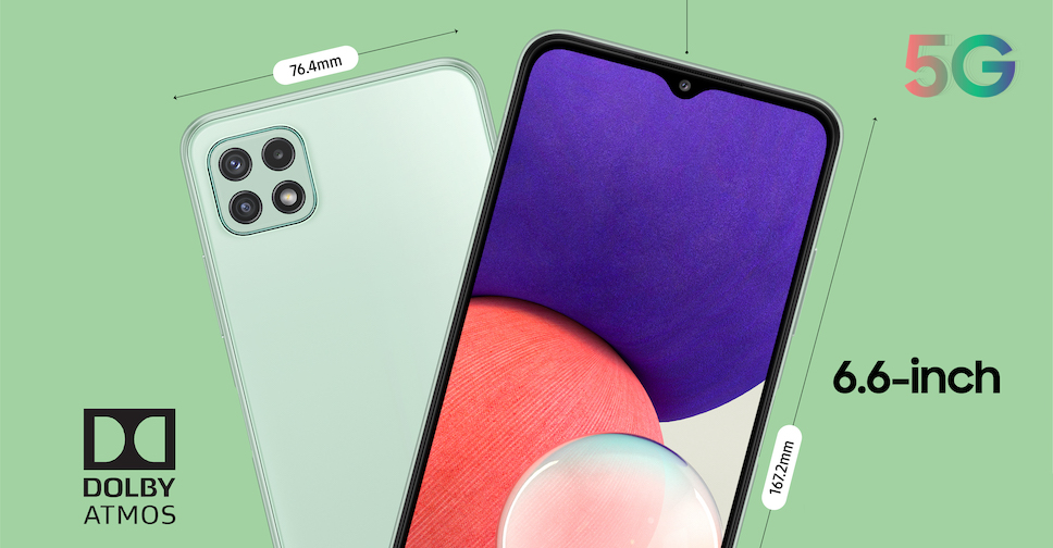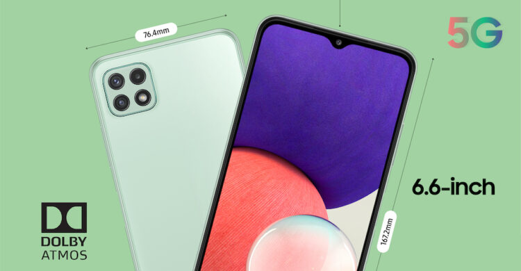 Galaxy A22 5G มาพร้อมจอแสดงผล Infinity-V Display, FHD+ TFT ขนาด 6.6 นิ้ว ติดตั้งเซ็นเซอร์สแกนลายนิ้วมือที่ขอบด้านข้าง (Side-Mounted Fingerprint) ขนาดบอดี้ 167.2 x 76.4 x 9 มิลลิเมตร น้ำหนัก 203 กรัม มีให้เลือก 4 สี ได้แก่ Gray, White, Mint, Violet