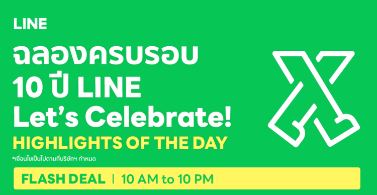 LINE ฉลองครบรอบ 10 ปีกับการเป็นแพลตฟอร์มเพื่อชีวิตยุคดิจิทัล ส่งพาเหรดกิจกรรมและโปรโมชันสุดฮอตแห่งปีที่ไม่ได้มีกันบ่อยๆ ชวนผู้ใช้ LINE หยิบมือถือเตรียมคว้าดีลแห่งปีที่ต้องห้ามพลาด ที่คราวนี้มาพร้อมกับ 4 โปรโมชันกับอีก 1 กิจกรรม จาก 5 บริการยอดฮิตของ LINE ทั้ง LINE STICKERS, LINE MELODY, LINE SHOPPING, LINE MAN และ LINE TIMELINE พร้อมลุ้นรางวัลรวมมูลค่ากว่าล้านบาท เริ่ม 23 มิ.ย. นี้