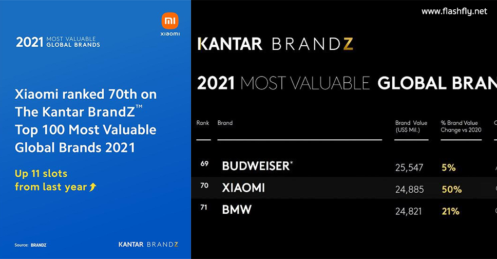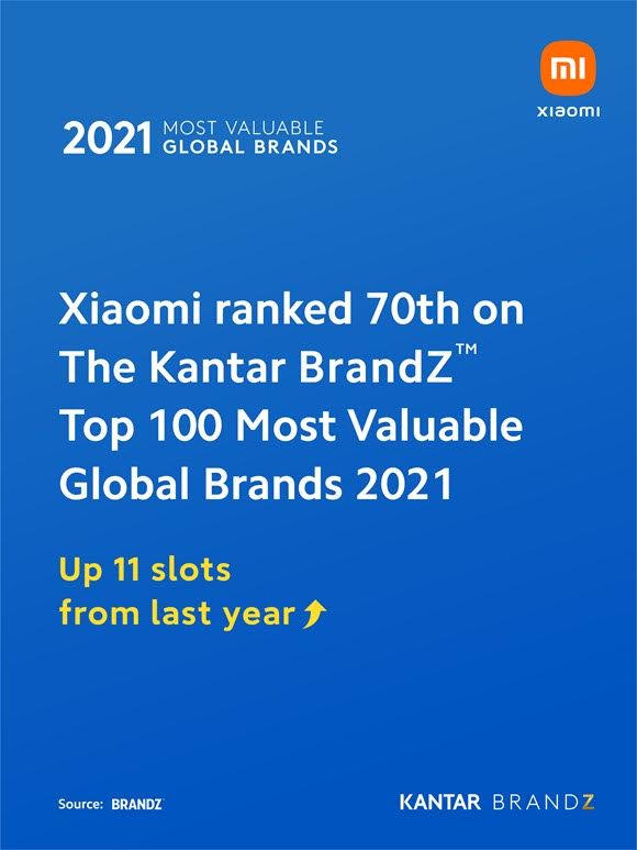 Xiaomi ขึ้นสู่อันดับ 70 ของแบรนด์ที่มีมูลค่าสูงที่สุดในโลกในปี 2021 สามปีซ้อน มูลค่าแบรนด์เพิ่มขึ้น 50% ตามรายงานของ Kantar