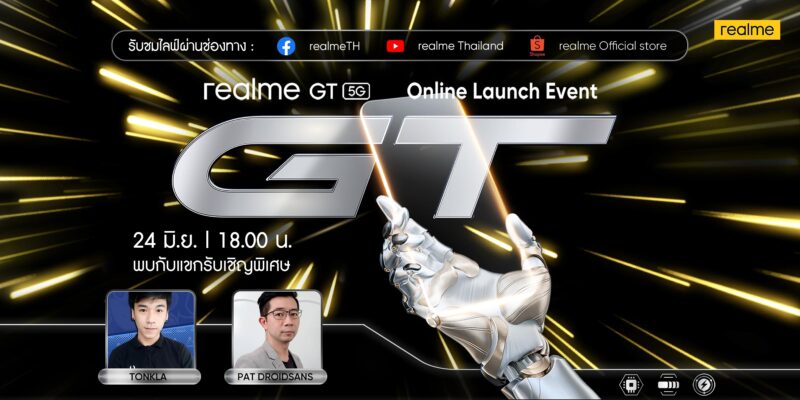 นอกจากนี้ พบกับแขกรับเชิญพิเศษ อย่าง Tonkla (ต้นกล้า) เกมเมอร์ชื่อดังขวัญใจคนรุ่นใหม่และคุณภัทร IT Blogger ชื่อดังจากเพจ Droidsans ในงานเปิดตัว realme GT 5G ผ่าน Live ถ่ายทอดสดทางเพจ realme TH Youtube channel : realmeThailand และ realme Official Store ทาง Shopee พร้อมกันทั่วประเทศ ในวันที่ 24 มิถุนายนนี้ เวลา18:00 น. สามารถติดตามรายละเอียดเพิ่มเติมได้ทาง https://www.facebook.com/realmeTH