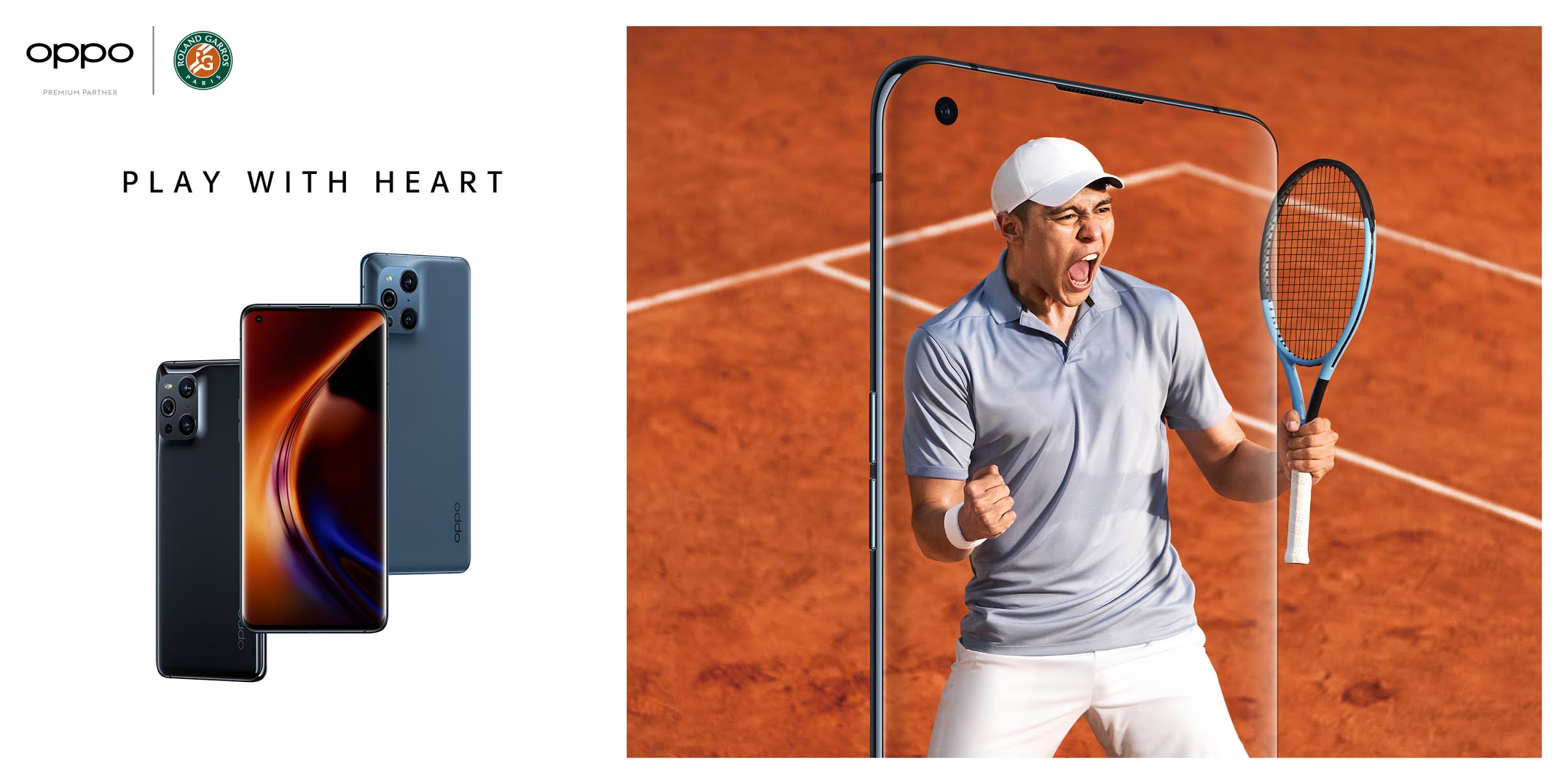 แคมเปญ Play With Heart นำเสนอความมุ่งมั่นของ OPPO ที่มีในการส่งเสริมกีฬาเทนนิส และด้านกีฬาอื่น ๆ การร่วมมือกับ Roland-Garros และ Wimbledon เป็นส่วนหนึ่งในภารกิจของ OPPO ที่จะยังคงเชื่อมต่อกับแฟนคลับรุ่นต่อไป ด้วยการจุดประกายความหลงใหลในการแข่งขัน และช่วงเวลาอันทรงพลังที่เกิดขึ้นภายในสนามเทนนิส
