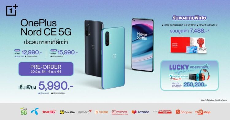 เท่านั้นยังไม่พอ ทาง OnePlus ยังมีกิจกรรม Lucky Experience จองแจกเพิ่ม : สำหรับผู้ที่จองสมาร์ทโฟน OnePlus Nord CE 5G ในระหว่างวันที่ 30 มิถุนายน – 6 กรกฎาคม 2564 ผ่านตัวแทนจำหน่ายอย่างเป็นทางการในประเทศไทย จะได้รับสิทธิ์ลุ้นรับรางวัล Nintendo Switch และ Ring Fit จำนวน 15 รางวัล มูลค่ารวมกว่า 250,200 บาท โดยประกาศรายชื่อผู้โชคดีผ่านทาง Facebook Fanpage OnePlus Thai ในวันที่ 14 กรกฎาคม 2564 ในเวลา 18.00 น.