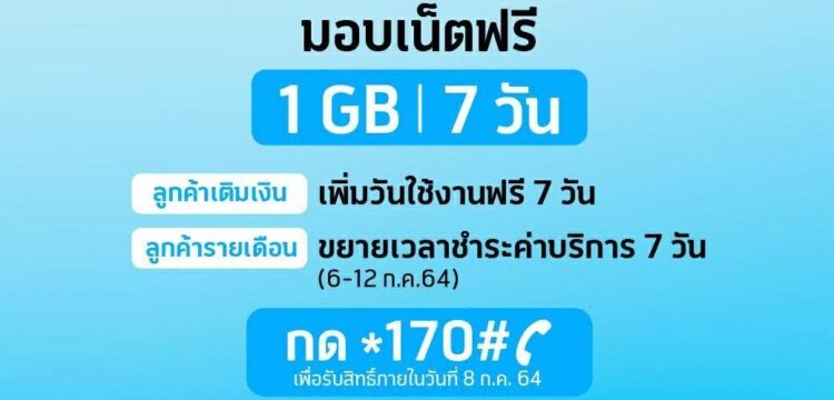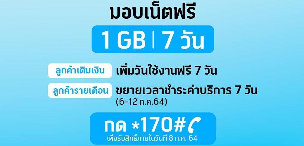 สำหรับลูกค้าดีแทคเติมเงิน – ลูกค้าดีแทคเติมเงินที่อาศัยในพื้นที่รัศมี 5 กิโลเมตร ดีแทคขอมอบเน็ตฟรี 1GB พร้อมขยายวันใช้งานเพิ่มเป็นจำนวน 7 วัน ระหว่าง 6-12 กรกฎาคม 2564