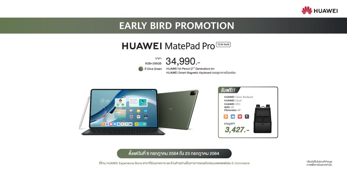 ของดีๆ แบบนี้มีเครื่องเดียวไม่น่าพอ ขอนำเสนอแท็บเล็ตตัวเด็ดอีกรุ่น HUAWEI MatePad Pro 12.6-inch ที่มาพร้อมหน่วยความจำ 8GB ความจุ 256GB มีให้เลือก 2 สี 2 สไตล์สุดคลาสสิกอย่างสี Matte Grey ที่วางจำหน่ายแล้วในราคา 28,990 บาท และสีใหม่แกะกล่องสี Olive Green ที่พร้อมให้ทุกคนได้จับจองเป็นเจ้าของแล้วในราคาสุดพิเศษ 34,990 บาท โดยมาพร้อมกับ HUAWEI M-Pencil (2nd generation) และ HUAWEI Smart Magnetic Keyboard บรรจุภายในกล่อง  พ่วงด้วยของสมนาคุณมูลค่ารวม 3,427 บาท เมื่อซื้อ HUAWEI MatePad Pro 12.6-inch สี Olive Green ระหว่างวันที่ 6 – 23 กรกฎาคม 2564 รับไปเลย HUAWEI Classic Backpack, HUAWEI Cloud (50GB ระยะเวลา 3 เดือน), HUAWEI VDO (ระยะเวลา 1 เดือน), WPS VIP (ระยะเวลา 3 เดือน) และ FilmoraGo VIP (ระยะเวลา 3 เดือน) โดยสามารถซื้อสินค้าได้ที่ HUAWEI Experience Store และช่องทางออนไลน์ ได้แก่ HUAWEI Store และร้านค้าอย่างเป็นทางการของหัวเว่ยที่ JD Central, Lazada และ Shopee