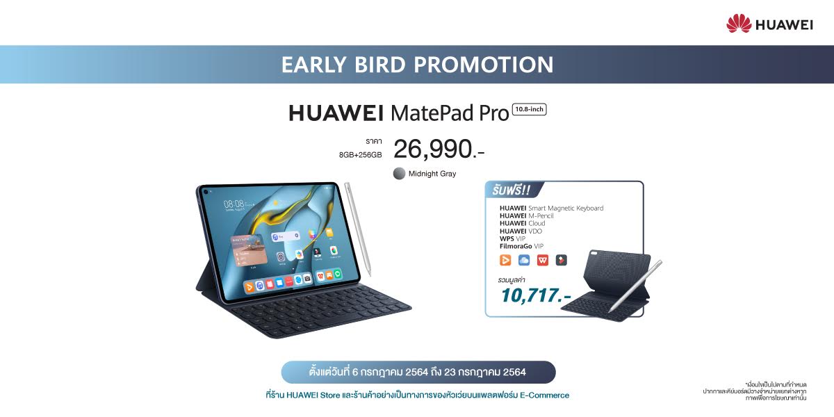ถ้าถูกใจ HUAWEI MatePad Pro 10.8-inch ก็ไม่ต้องรออะไรแล้วเพราะหากอยากได้ก็ต้องได้! บอกเลยว่ามีไว้เสริมสร้างจินตนาการก็ดี ทำงานก็ไม่แผ่ว พร้อมให้คุณได้เป็นเจ้าของแล้วในราคา 26,990 บาท พร้อมโปรจุกๆ เมื่อซื้อสินค้าตั้งแต่วันที่ 6 – 23 กรกฎาคม 2564 รับไปให้หนำใจกับ HUAWEI Smart Magnetic Keyboard, HUAWEI M-Pencil, HUAWEI Cloud (50GB ระยะเวลา 3 เดือน), HUAWEI VDO (ระยะเวลา 1 เดือน), WPS VIP (ระยะเวลา 3 เดือน) และ FilmoraGo VIP (ระยะเวลา 3 เดือน) มูลค่ารวม 10,717 บาท โดยสามารถสั่งซื้อผ่านช่องทางออนไลน์เท่านั้นที่ https://bit.ly/3xsKGAF HUAWEI Store และร้านค้าอย่างเป็นทางการของหัวเว่ยบนแพลตฟอร์ม E-Commerce อย่าง JD Central, Lazada และ Shopee