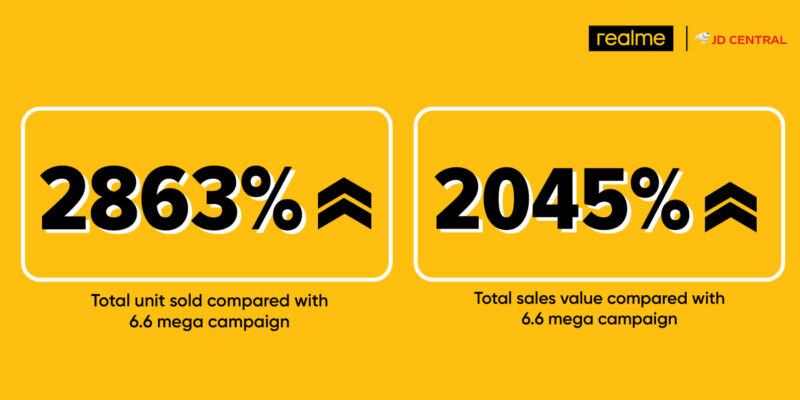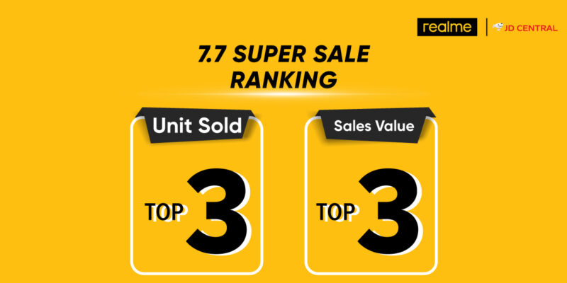 realme แบรนด์สมาร์ทโฟนเพื่อคนรุ่นใหม่ที่เติบโตเร็วที่สุดในโลก กวาดยอดขายพุ่งในช่วงแคมเปญ 7.7 SUPER SALE ทะยานสู่อันดับ 3 ในหมวดแบรนด์มือถือและแท็บเลต จากช่องทางออนไลน์ JD Central ยิ่งไปกว่านั้น ยังมียอดขายและมูลค่ารวมโตกระฉูดกว่า 2,000% เมื่อเทียบกับแคมเปญ 6.6 mega campaign ที่ผ่านมา