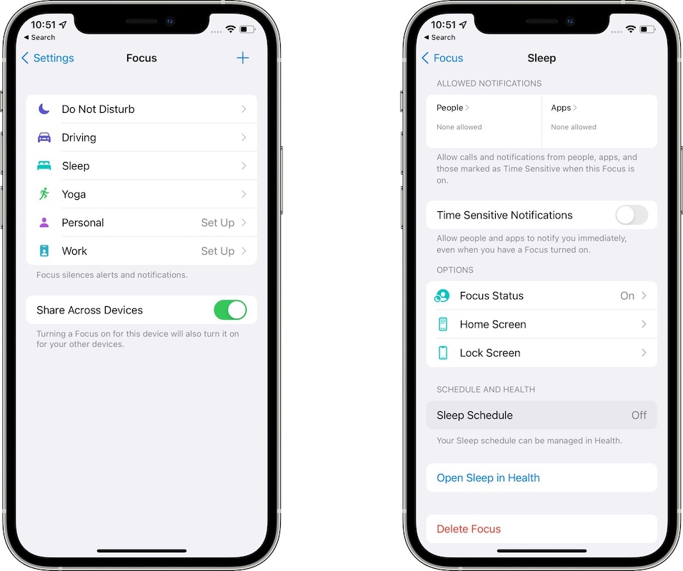 อินเทอร์เฟซ Focus ในแอป Settings ถูกลบตัวเลือก Focus Status และ Phone Calls ออกจากอินเทอร์เฟซหลัก โดยย้ายไปยังแต่ละส่วนของ Focus