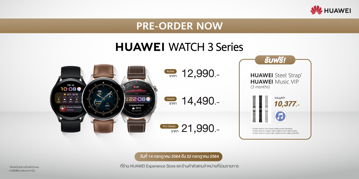 HUAWEI WATCH 3 Series มีให้เลือก 2 รุ่นด้วยกัน ได้แก่ HUAWEI WATCH 3 คนที่ชอบลุคสปอร์ตเรียบสวย สามารถเลือกใช้ Active Edition ราคา 12,990 บาท หรือคนที่ใช้แมชกับลุคทำงานอาจจะใช้เป็นหน้าปัดสเตนเลสสตีล สายหนัง Classic Edition ราคา 14,490 บาท ส่วนคนที่รักความหรูหราขึ้นไปอีกระดับ สามารถเลือก HUAWEI WATCH 3 Pro Classic Edition ที่มากับกรอบไทเทเนียม สายหนัง ตัวเรือนด้านหลังทำด้วยเซรามิก ราคา 21,990 บาท พร้อมโปรโมชันพรีออเดอร์สุดคุ้ม รับฟรี HUAWEI Steel Strap* และบริการ HUAWEI Music VIP นาน 3 เดือน รวมมูลค่า 10,377 บาท เมื่อซื้อสินค้าที่ HUAWEI Experience Store และร้านค้าตัวแทนจำหน่ายที่ร่วมรายการ ระหว่างวันที่ 14 กรกฎาคม 2564 ถึง 22 กรกฎาคม 2564 รวมถึงสามารถสั่งซื้อผ่านช่องทางออนไลน์ได้ที่ HUAWEI Online Store, Shopee, Lazada และ JD Central