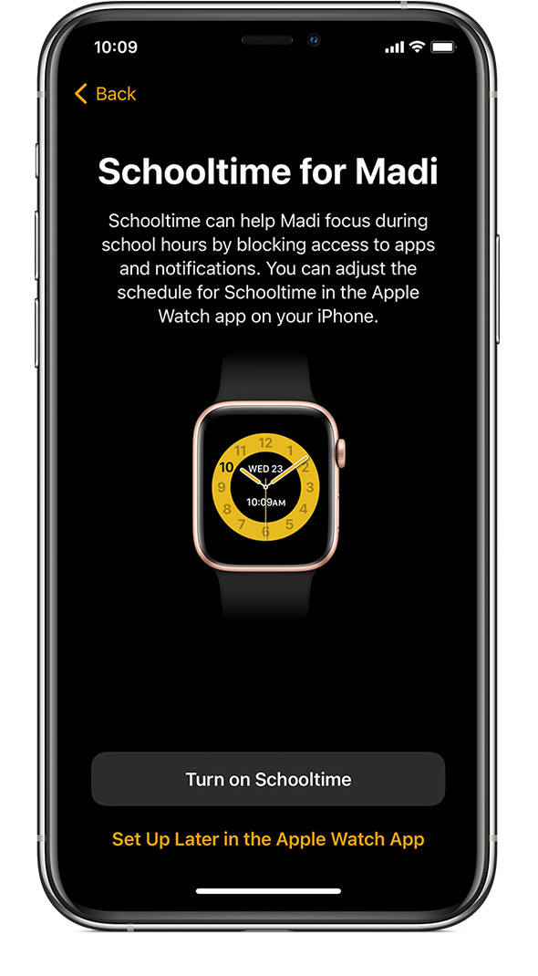 เมื่อโหมด Schooltime หรือ เวลาเรียน ถูกเปิดใช้งาน บนหน้าปัด Apple Watch ของเด็กๆ จะแสดงวงแหวนสีเหลือง ซึ่งเป็นการบ่งบอกว่ามีการจำกัดการเข้าถึงแอปและมีการเปิดโหมดห้ามรบกวนไว้ เพื่อให้เด็กที่สวมใส่และครูรับทราบว่า Apple Watch กำลังอยู่ใน Schooltime และจะไม่ทำให้เด็กๆ ที่สวมใส่เสียสมาธิในการเรียนอย่างแน่นอน