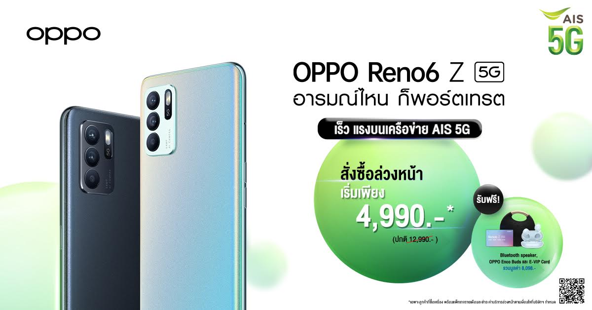 โดยล่าสุด OPPO ผนึกกำลังกับ เอไอเอส มอบข้อเสนอสุดพิเศษ OPPO Reno6 Z 5G ในราคาเริ่มต้นเพียง 4,990 บาท เมื่อสมัครแพ็คเกจรายเดือนกับ AIS เพียงเดือนละ 1,399 บาท พร้อมรับสิทธิพื้นที่ Google One 100GB นานสูงสุด 6 เดือน และสิทธิสามารถชม YouTube Premium นานสูงสุด 4 เดือน, AIS PLAY PREMIUM package นาน 3 เดือน พร้อมสามารถเพลิดเพลินไปกับ Disney+ Hotstar ราคาพิเศษ เฉพาะที่ AIS เท่านั้น! และสิทธิพิเศษอื่นๆ อีกมากมาย เท่านั้นยังไม่พอ! รับฟรี หูฟัง OPPO Enco Buds มูลค่า 999 บาท และของสมนาคุณจาก OPPO ฟรี! ทั้ง OPPO E-VIP CARD ประกันหน้าจอแตกนาน 1 ปี และ Bluetooth Speaker มูลค่ารวม 7,099 บาท ของแถมมีจำนวนจำกัด โดยเอไอเอสเปิดให้พรีออเดอร์แล้ว ตั้งแต่วันนี้ – 29 กรกฎาคม 2564 ที่ เอไอเอสช็อป และ ร้านเทเลวิซทุกสาขา