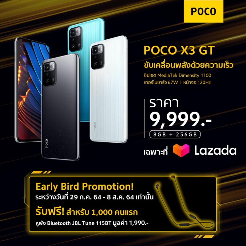 POCO แบรนด์เทคโนโลยียอดนิยมน้องใหม่ระดับโลก ประกาศเปิดตัว POCO X3 GT สมาร์ทโฟนที่ขับเคลื่อนพลังด้วยความเร็ว ซึ่งถูกออกแบบมาเพื่อความบันเทิงและการเล่นเกมโดยเฉพาะ พร้อมจำหน่ายแล้ววันนี้ที่ Lazada เท่านั้น ในราคา 9,999 บาท พร้อมโปรโมชั่นพิเศษสำหรับลูกค้า 1,000 คนแรกที่ซื้อสินค้าในระหว่างวันที่ 29 กรกฎาคม – 8 สิงหาคม 2564 รับฟรี หูฟัง Bluetooth JBL 115BT มูลค่า 1,990 บาท