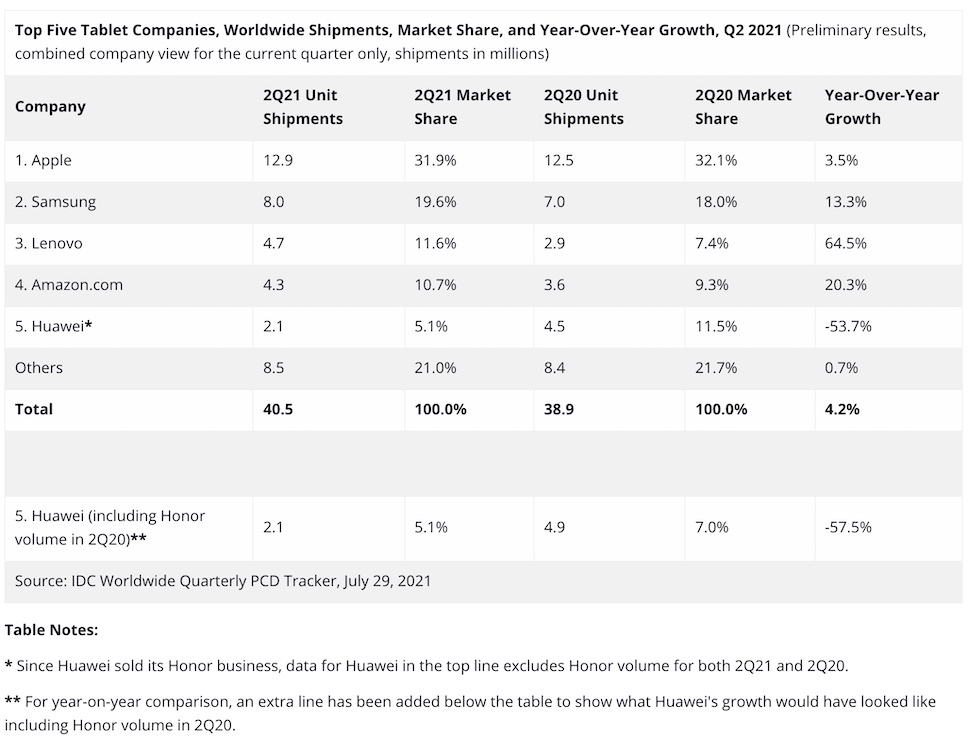 สรุปแล้ว ในไตรมาสที่ 2 ปี 2021 มียอดจัดส่งแท็บเล็ตทั่วโลก 40.5 ล้านเครื่อง เติบโตขึ้น 4.2% เมื่อเทียบกับไตรมาสเดียวกันของปีก่อน ซึ่งมียอดจัดส่งรวม 38.9 ล้านเครื่อง