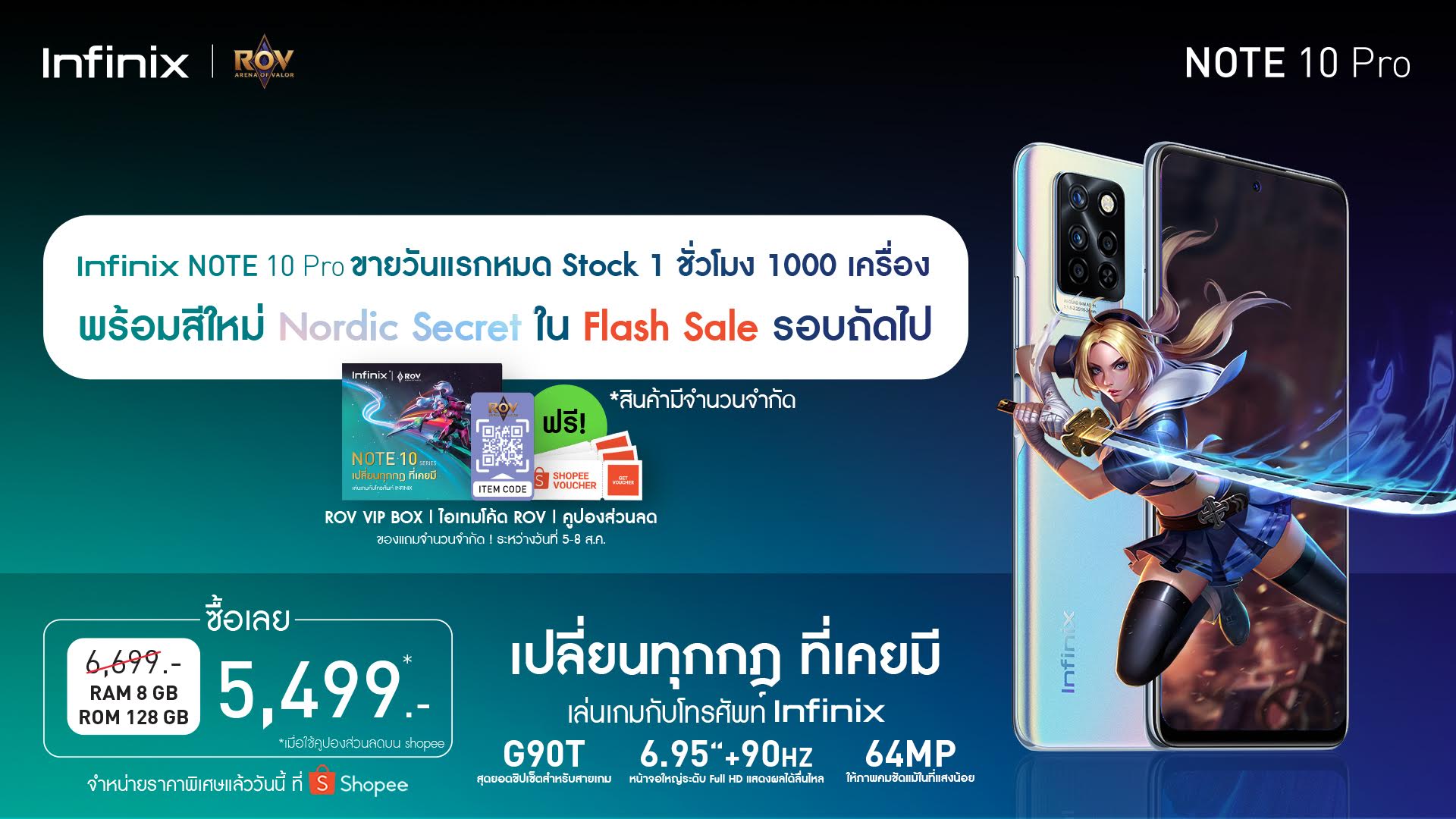 อินฟินิกซ์ (Infinix) แบรนด์สมาร์ตโฟนระดับโลกที่ประสบความสำเร็จและได้รับความนิยมเป็นอย่างมากทั้งในต่างประเทศและประเทศไทย สร้างปรากฏการณ์ New High สินค้าหมด Stock ใน Flash Sale รอบแรกช่วงเที่ยงคืนของวันที่ 5 สิงหาคม 2564 ที่ผ่านมา บน Shopee กับเกมมิ่งสมาร์ตโฟน Infinix NOTE 10 Pro ด้วยยอดคำสั่งซื้อ 1,000 เครื่อง ภายใน 1 ชั่วโมง โดยสมาร์ตโฟนรุ่นนี้ได้รับกระแสตอบที่ดีจากผู้ใช้งานและแฟนๆ ที่รอคอยเป็นอย่างมาก ถือเป็นความสำเร็จอีกก้าวของแบรนด์สมาร์ตโฟนอินฟินิกซ์ สำหรับ Infinix NOTE 10 Pro ผู้ที่พลาดโปรโมชั่นรอบนี้สามารถรอติดตามโปรโมชั่น Flash Sale ในรอบถัดไปได้ และร่วมกดรับคูปองส่วนลดได้ตลอดในช่วงเทศกาล Double date 8.8 ซึ่งท่านจะได้ Infinix NOTE 10 Pro ในราคาที่ดีที่สุดพิเศษเพียง 5,499 บาท
