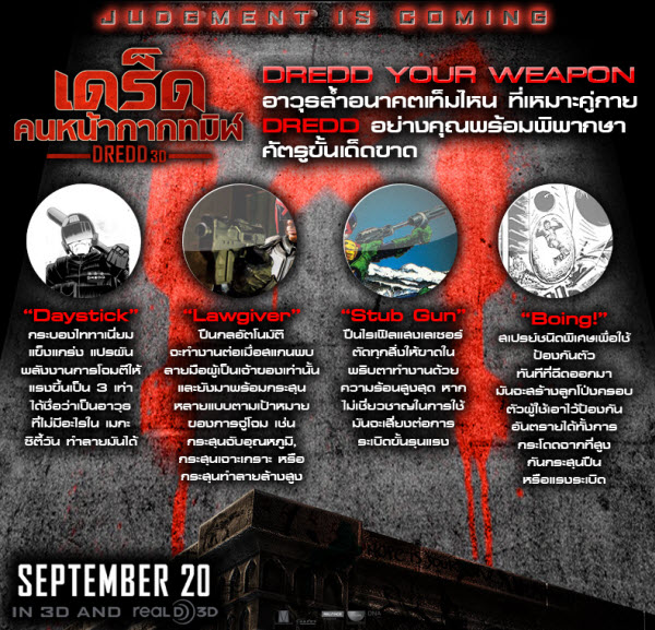 ถึงเวลาแล้วที่ “เหล่าร้าย” จะต้องผวา เมื่อเจอกับ ผู้ผดุงความยุติธรรมที่ “ร้ายกว่า!!” DREDD 3D เดร็ดด์ ทรีดี 20 กันยายนนี้