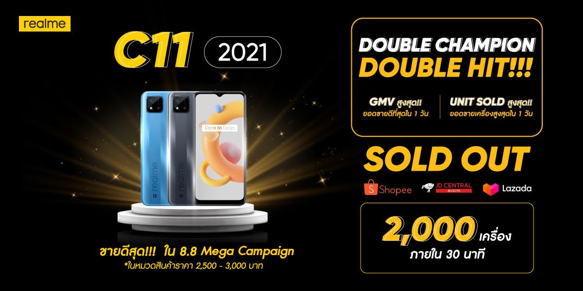 realme แบรนด์สมาร์ทโฟนเพื่อคนรุ่นใหม่ที่เติบโตเร็วที่สุดในโลก ประกาศความสำเร็จอีกขั้น บนช่องทาง E-Commerce อย่าง Shopee, JD Central และ Lazada ในแคมเปญ 8.8 Mega Campaign โดยกวาดยอดขายดีที่สุดและยอดขายเครื่องสูงสดใน 1 วัน นำขบวนโดย realme C11 2021 ที่ได้ขายหมดเป็นที่เรียบร้อย 2,000 เครื่องภายใน 30 นาที นับว่าเป็นสมาร์ทโฟนที่ขายดีที่สุดในหมวดราคา 2,500 – 3,000 บาท