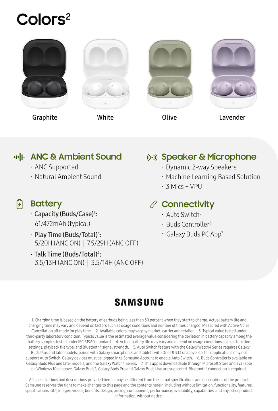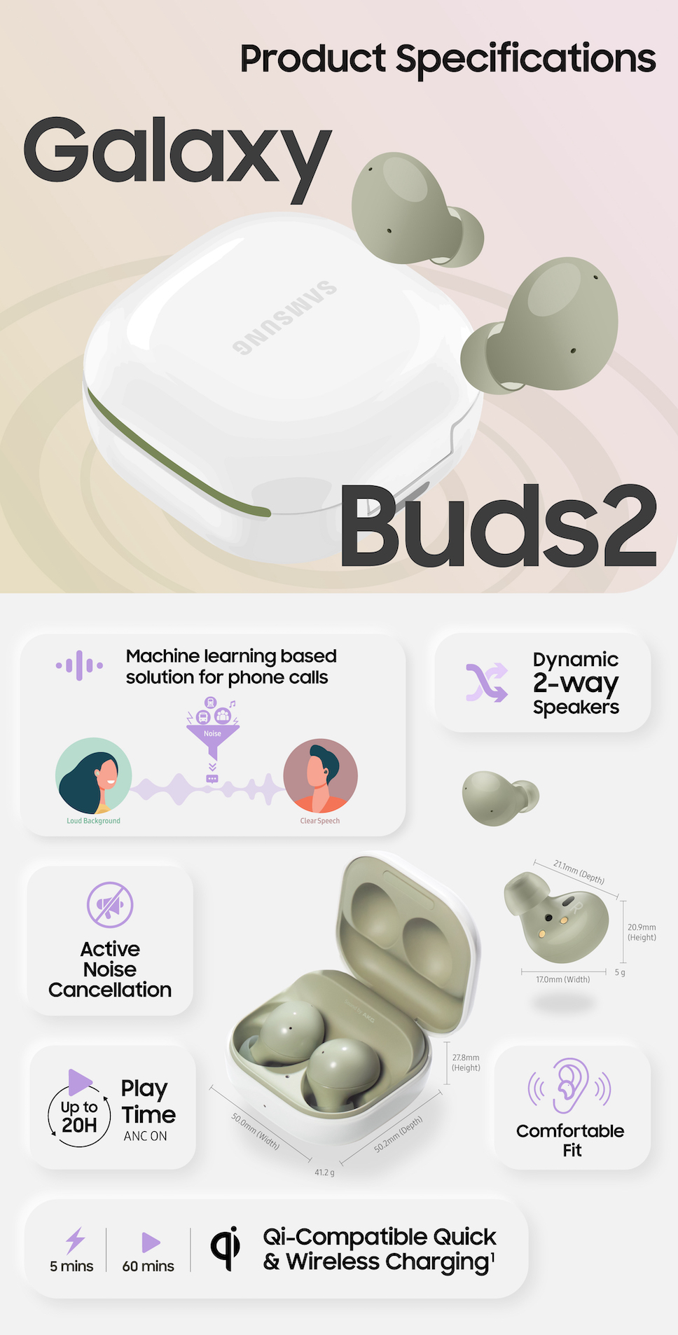 Samsung แนะนำหูฟังไร้สาย TWS รุ่นใหม่ Galaxy Buds 2 มาพร้อมระบบตัดเสียงรบกวน ANC (Active Noise Cancellation) รองรับการเชื่อมต่อ Bluetooth 5.2 โดยจะวางจำหน่ายในราคา 149.99 ดอลล่าร์สหรัฐ หรือราว 4,990 บาท มี 4 สีให้เลือก ได้แก่ Graphite, White, Olive และ Lavender ส่วนที่ประเทศไทยราคาทางการอยู่ที่ 3,990 บาท