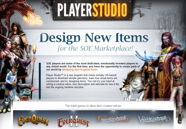 “โซนี่ ออนไลน์ เอนเตอร์เทนเมนท์” เปิดตัว Player Studio โปรแกรมใหม่ที่เปิดโอกาสให้ผู้เล่นสามารถสร้างสรรค์ไอเท็มภายในเกม ซึ่งไอเท็มที่สร้างขึ้นมายังมีโอกาสที่จะถูกนำไปขายได้จริง โดยในเบื้องต้นจะมี 2 เกมออนไลน์ที่รองรับโปรแกรมดังกล่าว ได้แก่ EverQuest และ EverQuest II