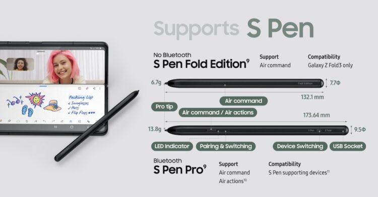 ต้นปีที่ผ่านมา Samsung ได้เปิดตัว Galaxy S21 Ultra สมาร์ทโฟน Galaxy S รุ่นแรกที่สนับสนุน S Pen และล่าสุดเรามี Galaxy Z Fold 3 สมาร์ทโฟนพับจอได้รุ่นแรกของ Samsung ที่รองรับปากกา S Pen เช่นเดียวกัน โดยมีให้เลือกื 2 แบบ S Pen Fold Edition และ S Pen Pro ซึ่งมีความเหมือนและแตกต่างกันดังนี้