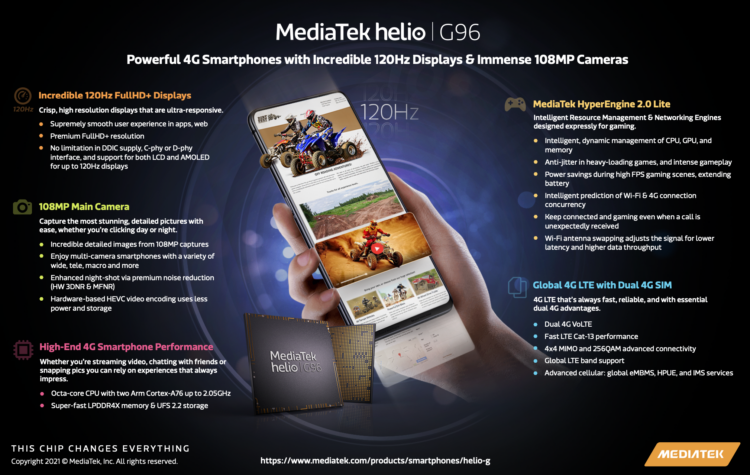 ชิป SoC รุ่น Helio G96 ของ MediaTek จะทำให้ผู้ใช้มือถือได้รับประสบการณ์ระดับพรีเมียมในทุก ๆ วัน เพราะชิปรองรับความถี่การแสดงผลหน้าจอ 120Hz ที่มาพร้อมกับความละเอียดสูงถึงระดับ FullHD+ คุณจึงสามารถเลื่อนหน้าเว็บและเห็นภาพอะนิเมชันในแอปพลิเคชันต่าง ๆ ลื่นไหลขึ้นอย่างเห็นได้ชัด อีกทั้งการรองรับความถี่การแสดงผลหน้าจอ Helio G96 120Hz ยังไม่มีข้อจำกัดเรื่องการใช้เทคโนโลยี DDIC อินเตอร์เฟส C-phy หรือ D-phy และยังรองรับทั้งการแสดงผลหน้าจอแบบ LCD หรือ AMOLED ได้อีกด้วย มากกว่านั้น Helio G96 ของ MediaTek ยังมีคุณสมบัติและความสามารถต่าง ๆ ที่น่าตื่นตาตื่นใจอีกมากมายสำหรับสมาร์ทโฟน 4G ที่ผสมผสานการรองรับความละเอียดกล้องสูงถึง 108MP เข้าไว้เพื่อให้คุณเก็บรายละเอียดได้ทุกเม็ด อีกทั้งยังมีการผสานรวมโมเด็ม Cat-13 4G LTE WorldMode ที่ฉับไว ซิมคู่ 4G และการให้บริการระบบ VoLTE และ ViLTE ทั้งหมดนี้ยังมาพร้อมกับ เอ็นจิ้นการจัดการทรัพยากรอัจฉริยะ (Intelligent Resource Management Engine) และเอ็นจิ้นเชื่อมโยงโครงข่าย (Networking Engine)