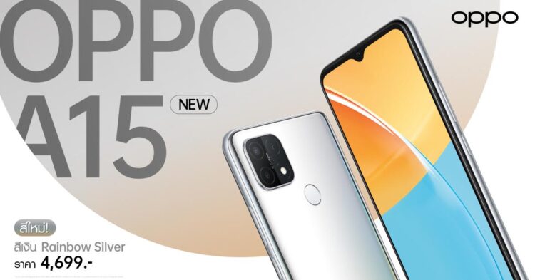 OPPO ประกาศการกลับมาของสมาร์ทโฟนน้องเล็ก OPPO A15 NEW ที่ล่าสุด! มาในสีใหม่ สีเงิน Rainbow Silver สวยสะกดทุกสายตา โดยวางจำหน่ายพร้อมกันทั่วประเทศตั้งแต่วันที่ 20 สิงหาคม 2564 ในราคาเพียง 4,699 บาท เท่านั้น