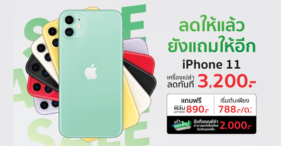Studio 7 มอบส่วนลดสูงสุด 3,200 บาท สำหรับ iPhone 11 เครื่องเปล่า แถมฟรี!! ฟิล์มกันรอยมูลค่า 890 บาท และรับส่วนลดเพิ่ม 2,000 บาท เมื่อนำเครื่องเก่ามาแลกซื้อ อีกทั้งยังให้ผ่อนเริ่มต้นเพียงเดือนละ 788 บาท คำนวณจาก รุ่น 64GB ผ่อน 0% นาน 24 เดือน กับบัตรเครดิตที่ร่วมรายการ