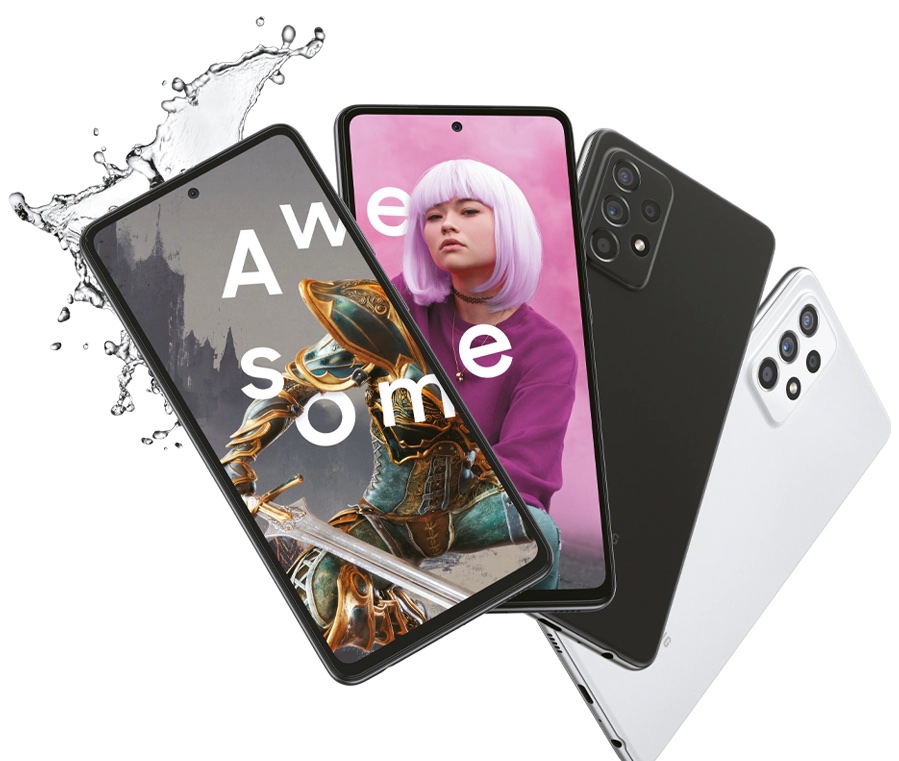 Samsung ยังเผยโฉมสมาร์ทโฟน Galaxy A52s 5G ออกมาให้เห็นแล้ว ซึ่งช่วยยืนยันว่าได้รับการออกแบบมาให้ป้องกันน้ำได้ ใช้จอแสดงผล Infinity-O Display (เจาะหลุมบนหน้าจอเพื่อติดตั้งกล้องเซลฟี่) มีกล้องหลัง 4 ตัว ด้านล่างจะเห็นพอร์ตเชื่อมต่อ USB Type-C และ ช่องเสียบหูฟัง 3.5 มิลลิเมตร