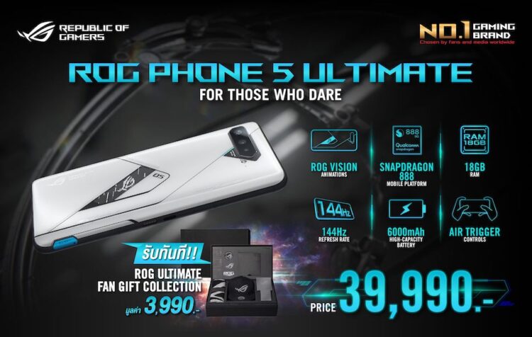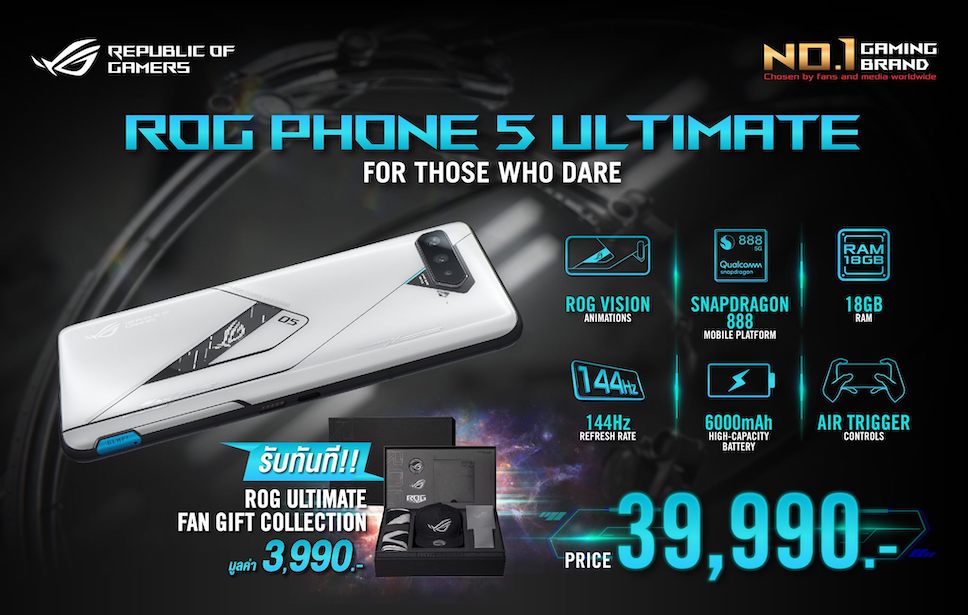 ROG Phone 5 Ultimate วางจำหน่ายแล้ววันนี้ ในราคา 39,990 บาท (RAM 18GB + ROM 512GB) รับฟรี!! ROG Ultimate Fan Gift Collection ประกอบไปด้วย ROG Building Block, ROG Baseball Cap, ROG Stickers, ROG Playing Card, ROG Patches, ROG Mask Cover และ ROG Towel มูลค่ารวม 3,990 บาท (ของแถมมีจำนวนจำกัด)