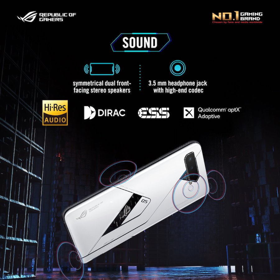 ลำโพงคู่หน้า และระบบเสียงเฉพาะ ROG Phone 5 ที่ร่วมมือกับ DIRAC ปรับแต่งออกมาให้มีคุณภาพเสียงที่มากกว่าเดิม และยังมีช่องเสียบหูฟังขนาด 3.5 มิลลิเมตร
