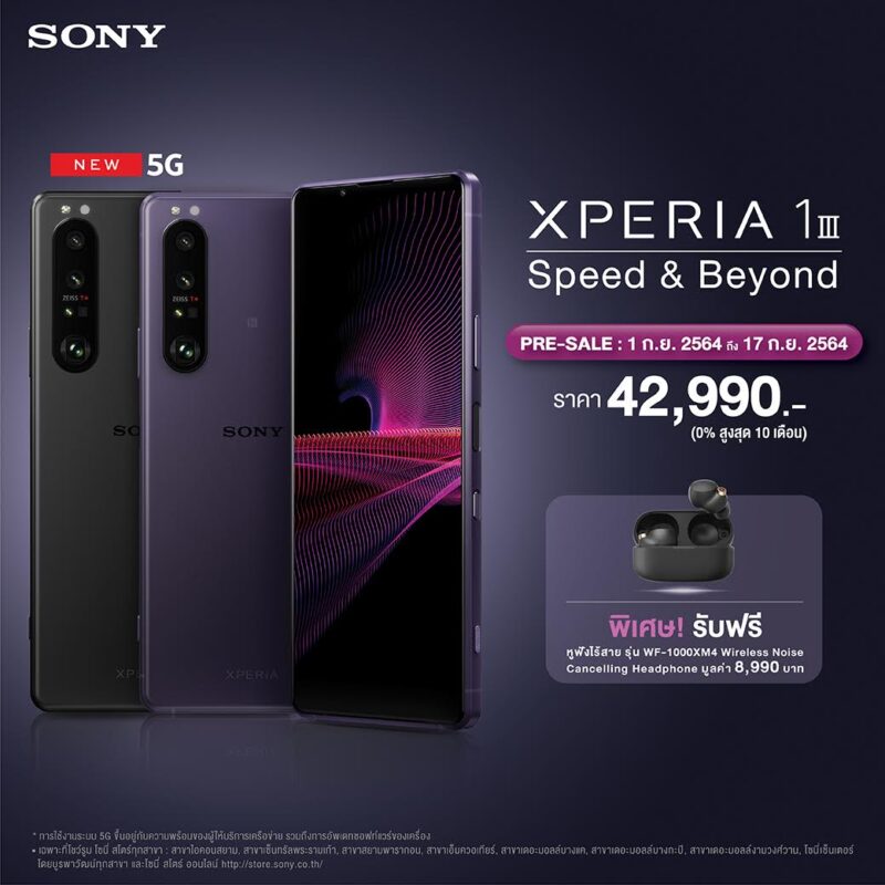 สำหรับ “Xperia 1 III” พร้อมวางจำหน่ายในตลาดเมืองไทย กันยายน ศกนี้ ในราคา 42,990 บาท โดยตัวเครื่องมีสีให้เลือก 2 สีด้วยกัน คือ สีดำ Frosted Black และ สีม่วง Frosted Purple มาพร้อมโปรโมชั่นสุดพิเศษสำหรับลูกค้าที่จองซื้อเครื่อง ตั้งแต่วันที่ 1 ถึง 17 กันยายน ศกนี้ โดยผู้สั่งจองล่วงหน้าจะได้รับ หูฟังไร้สาย WF-1000XM4 Wireless Noise Cancelling Headphone สีดำ มูลค่า 8,990 บาท เพื่อรับประสบการณ์บันเทิงได้อย่างเต็มอิ่ม โดยสามารถสั่งจองได้ที่ https://store.sony.co.th/collections/xperia-1